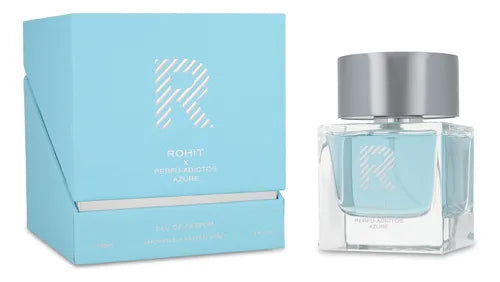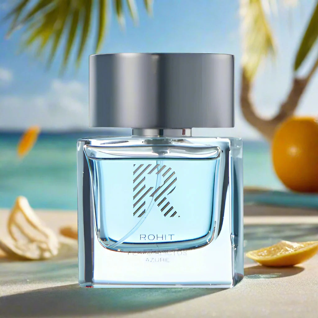 Rohit Azure, a unisex fragrance crafted to evoke freshness and depth. It opens with sparkling citrus notes and softly transitions into a warm, lingering amber embrace.