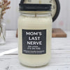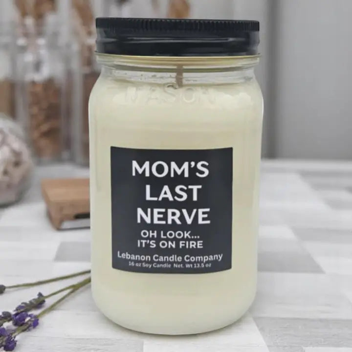 Funny candle that says mom's last nerve oh look it's on fire. Make mom laugh with this laugh out loud candle.