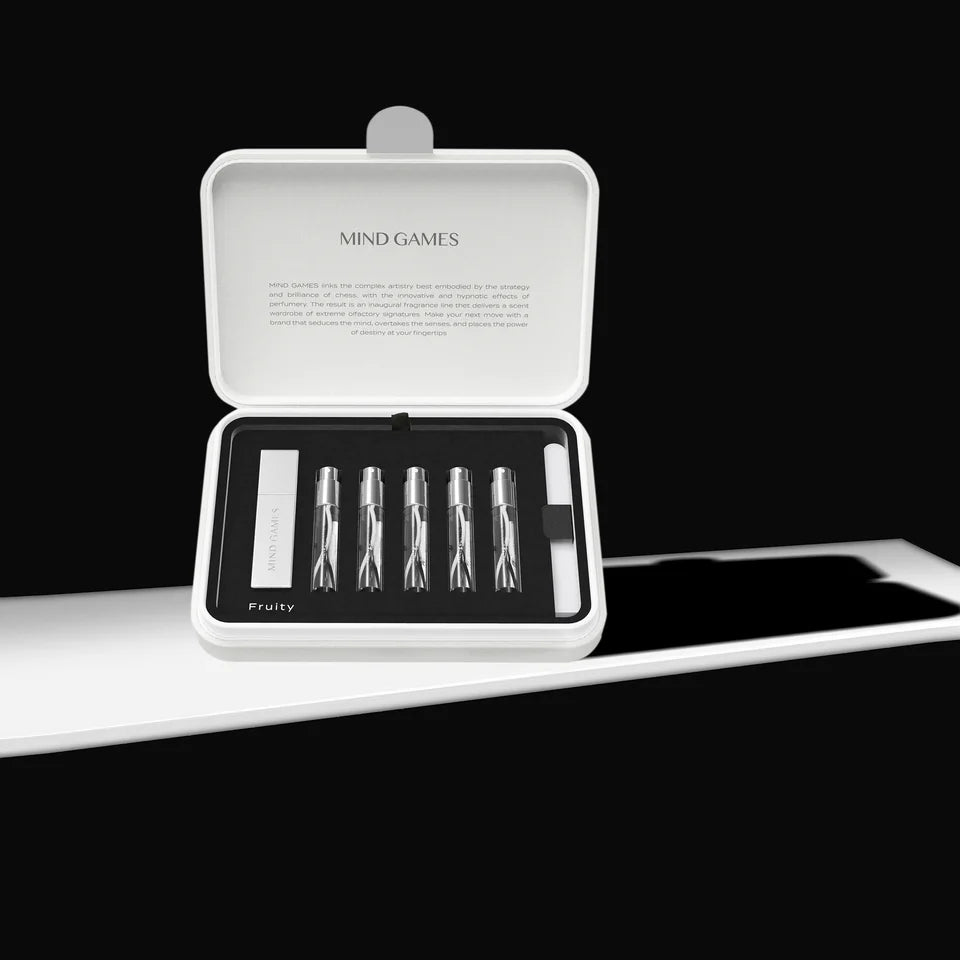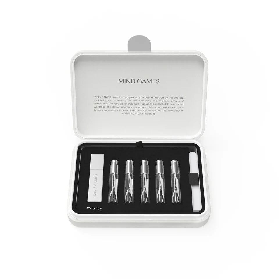 The 5 Piece Olfactive Discovery Set - Fruity includes one reusable solid Zamak travel case with 5-7.5 ML unisex extrait de parfum atomizers, housed in a luxurious chess-inspired coffret. .